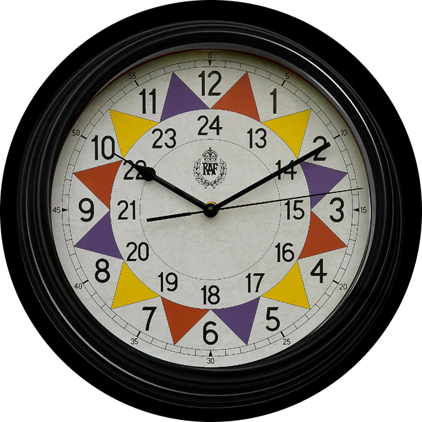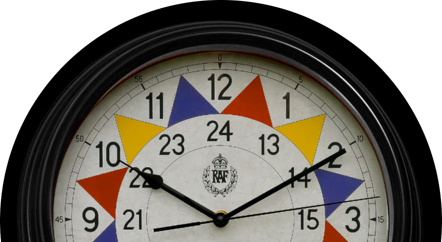 The Battle of Britain sector clock was a crucial tool used by RAF operations rooms during World War II to track enemy aircraft and coordinate defensive strategies. Split into coloured segments (red, yellow, and blue) it helped plot movements across five-minute intervals, allowing commanders to respond with precision. This clock wasn't just functional but it became a symbol of coordination, vigilance, and resilience. Elements of its design are subtly brought into the Horizon watch: