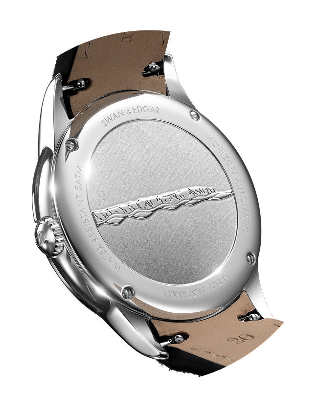 The Horizon’s caseback showcases a sculpted 3D silhouette of the Dover Cliffs. This is brought to life with contrast deep-polished and sandblasted finishes, capturing the cliffs’ dramatic beauty and the watch’s meticulous craftsmanship.