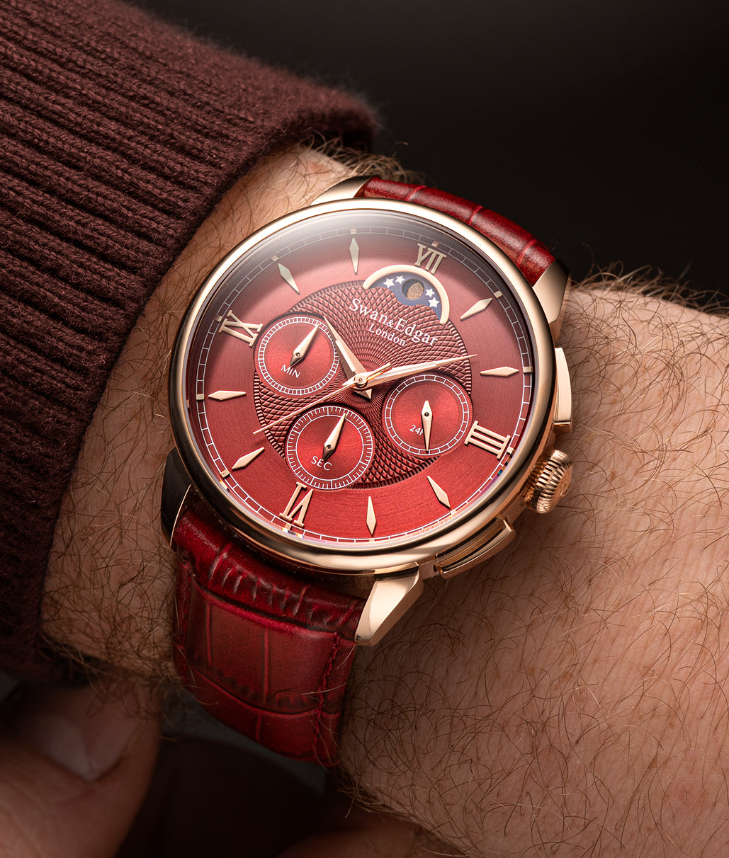 The Complication is a refined fusion of heritage and innovation. At its heart is a modified mecha-quartz chronograph movement, uniquely adapted to include a luminous moon phase at 12 o’clock. The dial showcases a trio of textures: guilloché at the centre, radial brushing, and recessed sunburst sub-dials, capturing depth and reflecting light from all angles. A combination of brushed and polished finishes flows across the sculpted horn lugs and case, all crafted from a single solid piece, a detail that reflects both visual refinement and structural precision.
