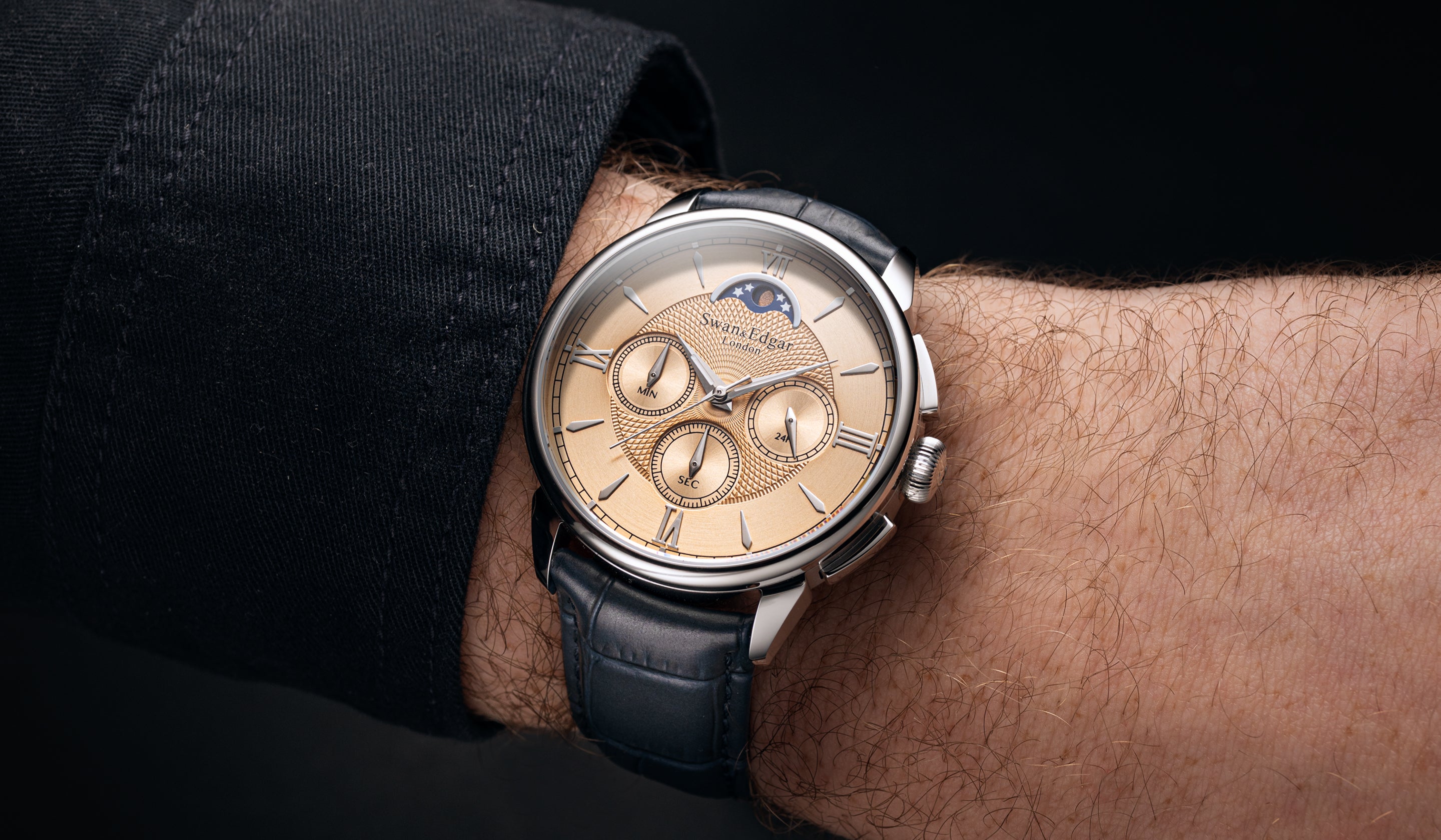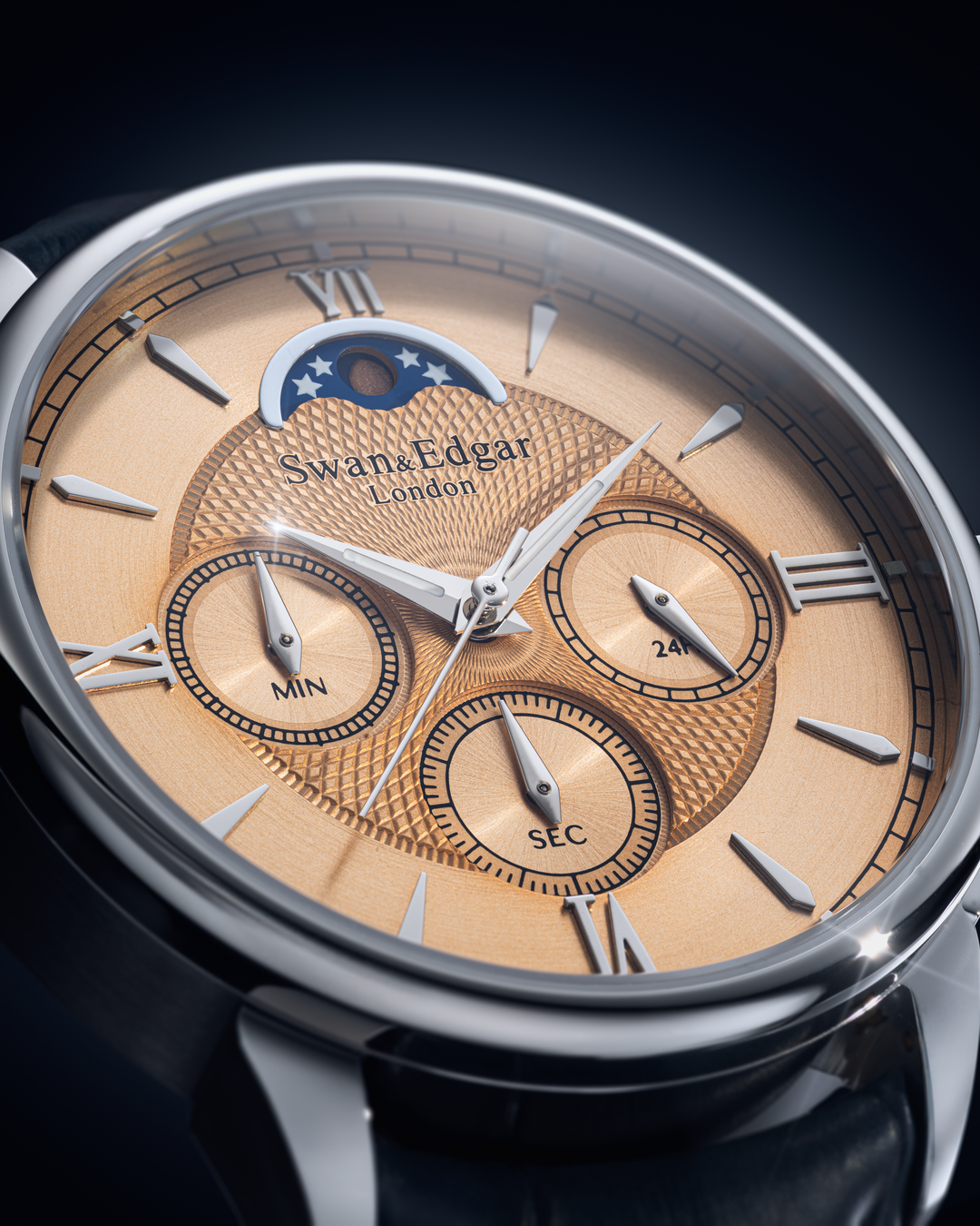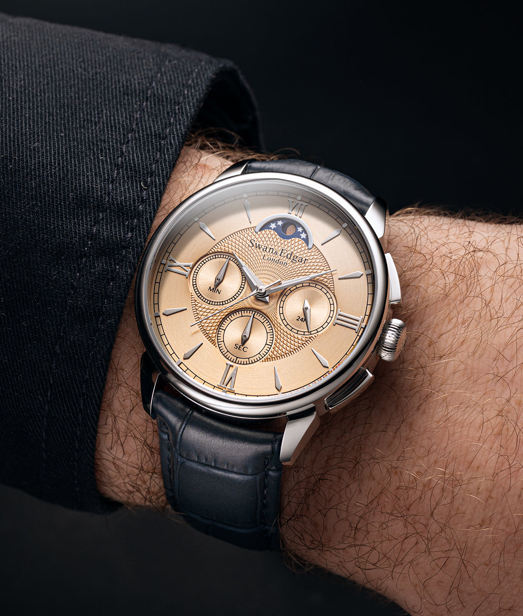 Japanese Super-LumiNova®, trusted by the world’s finest watchmakers, is thoughtfully applied to the moon phase complication and hands, ensuring clear legibility in low light without compromising the watch’s refined aesthetic. This selective application offers both functional clarity and a subtle, sophisticated glow, enhancing visibility only where it's needed most.