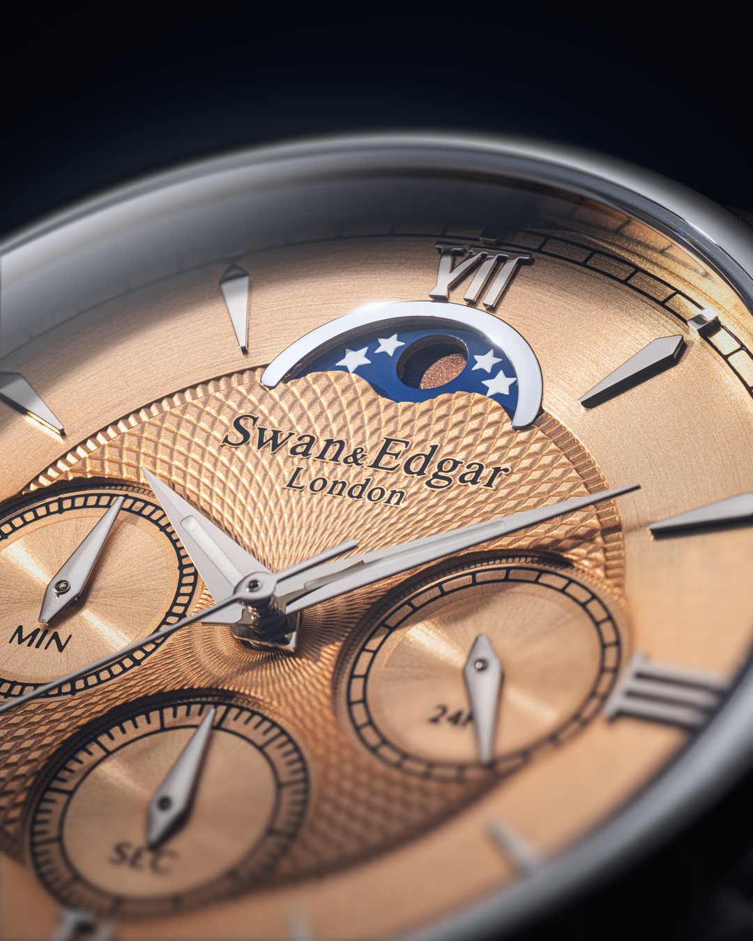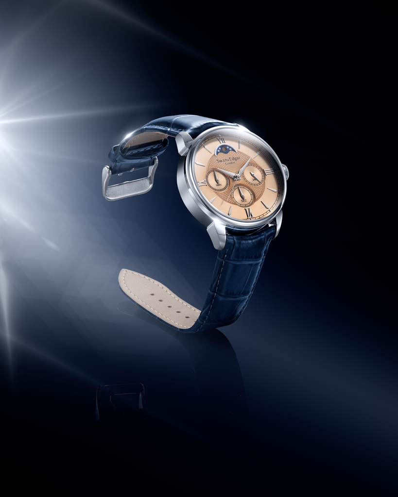Every index is applied by hand, giving the dial dimensionality and elegance. Most distinctively, the custom typeface is inspired by the World Time Clock situated opposite the original Swan & Edgar store at Piccadilly Circus, reflecting the brand’s London heritage. A quiet but powerful tribute.