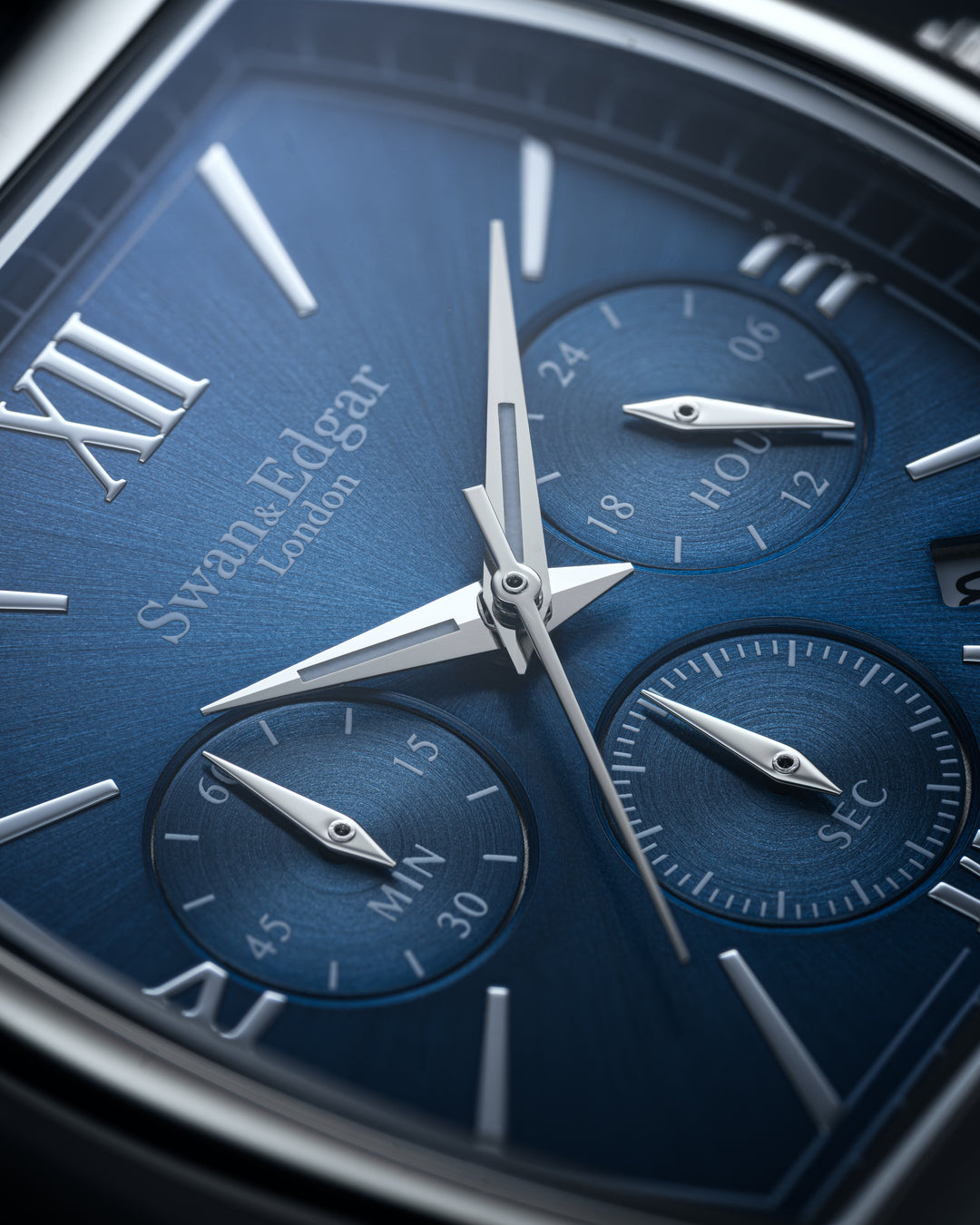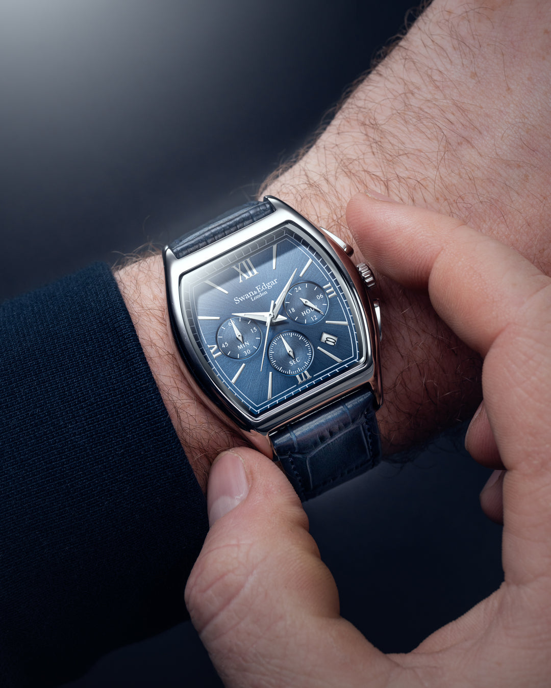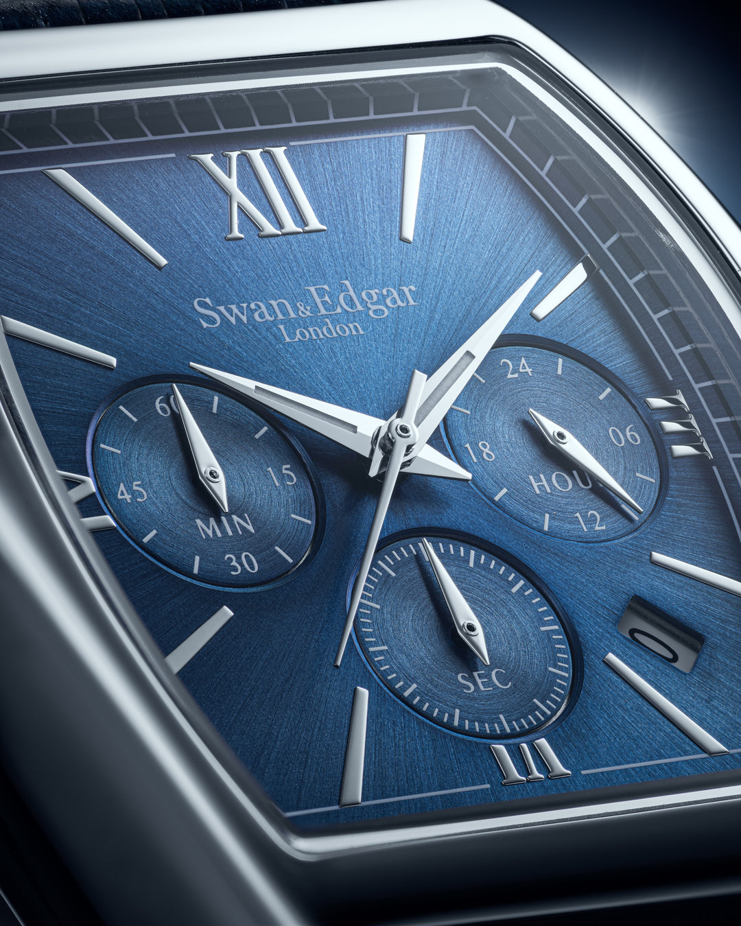 The Diplomat is a study in precision and presence. Powered by a reliable mecha-quartz chronograph, it features a dual-textured dial that combines sunburst brushing with circular-grained subdials for clarity and depth. Recessed counters, angular Dauphine hands with Super-LumiNova®, and a bold curved tonneau case reflect a design language rooted in heritage but shaped by modern restraint. Every detail, from the custom pushers to the bespoke typeface, speaks to refined British design and swap quiet confidence for elegance.