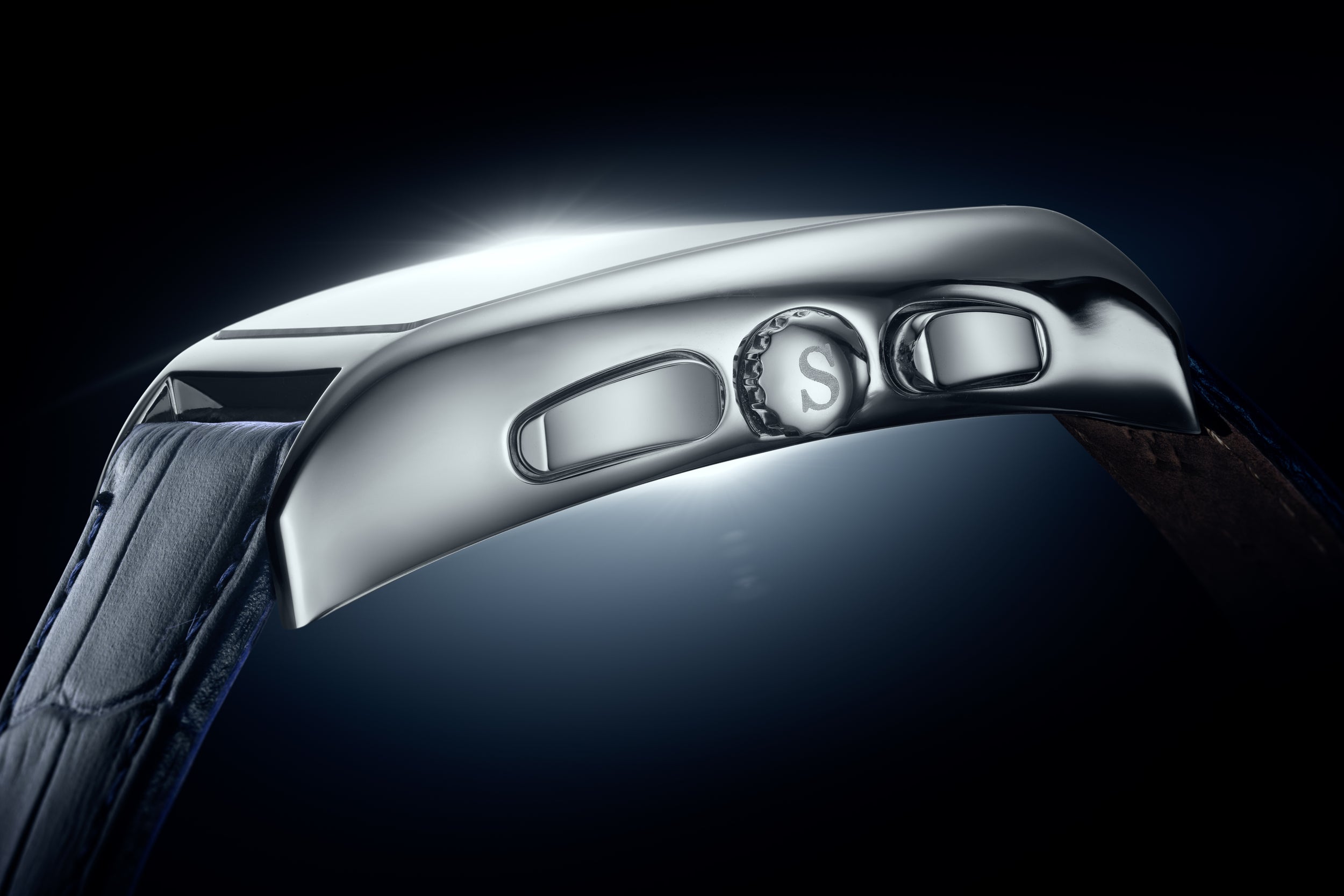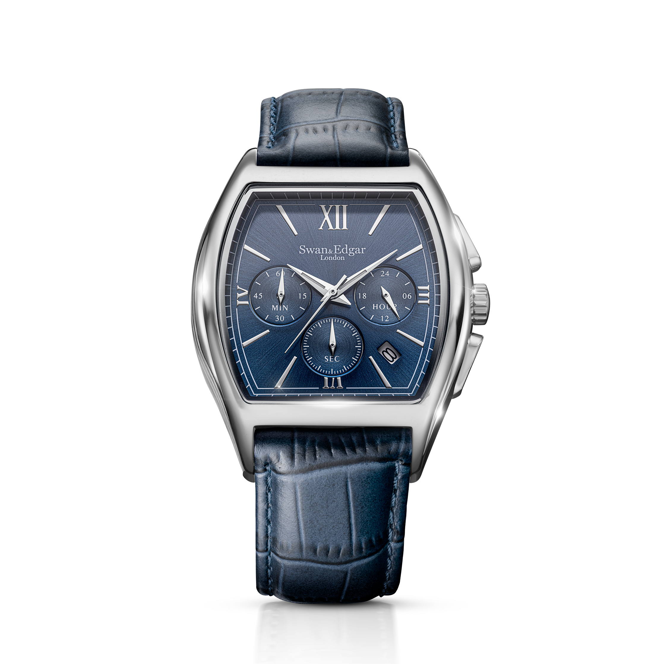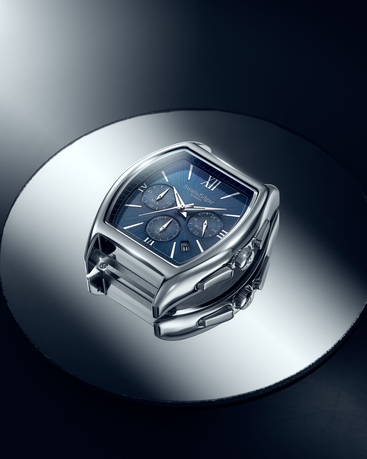 The Diplomat is a study in precision and presence. Powered by a reliable mecha-quartz chronograph, it features a dual-textured dial that combines sunburst brushing with circular-grained subdials for clarity and depth. Recessed counters, angular Dauphine hands with Super-LumiNova®, and a bold curved tonneau case reflect a design language rooted in heritage but shaped by modern restraint. Every detail, from the custom pushers to the bespoke typeface, speaks to refined British design and swap quiet confidence for elegance.